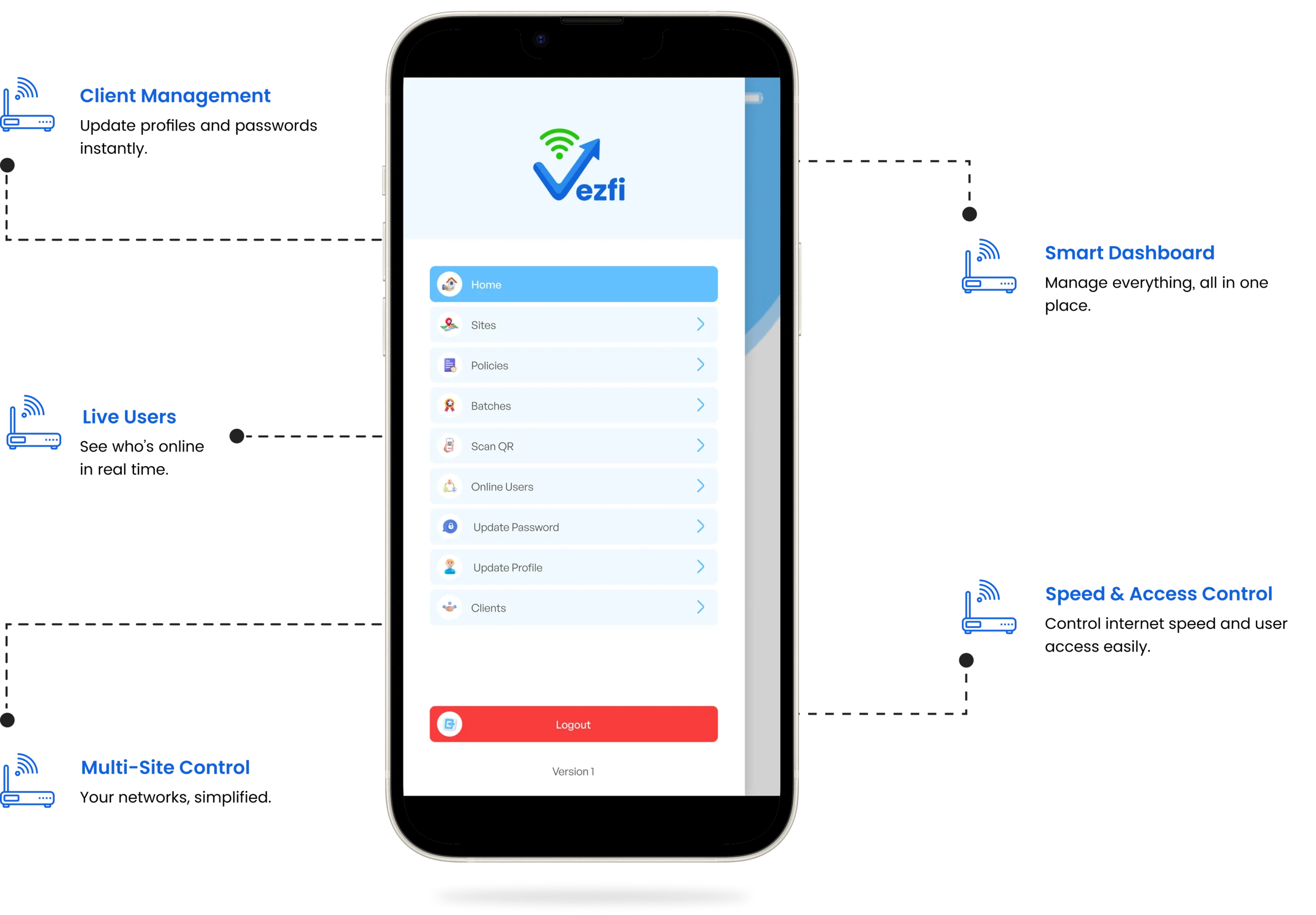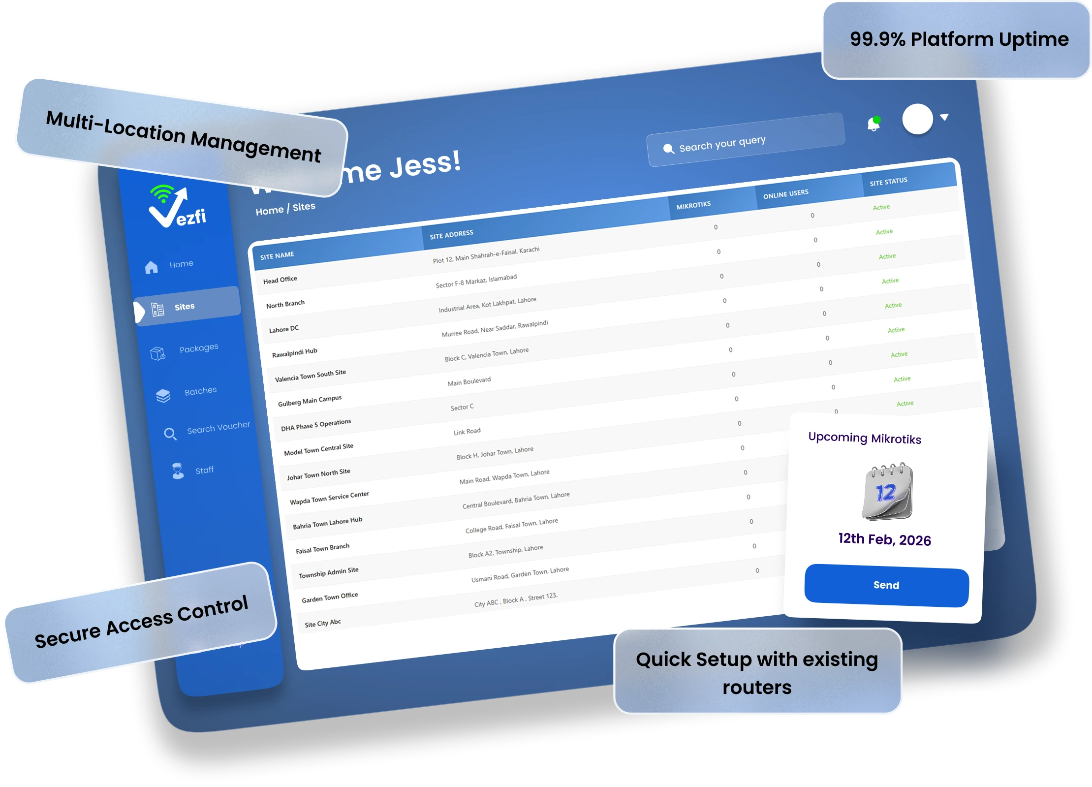 From single locations to multi-site deployments, Vezfi provides full visibility, control, and security over every connected user.